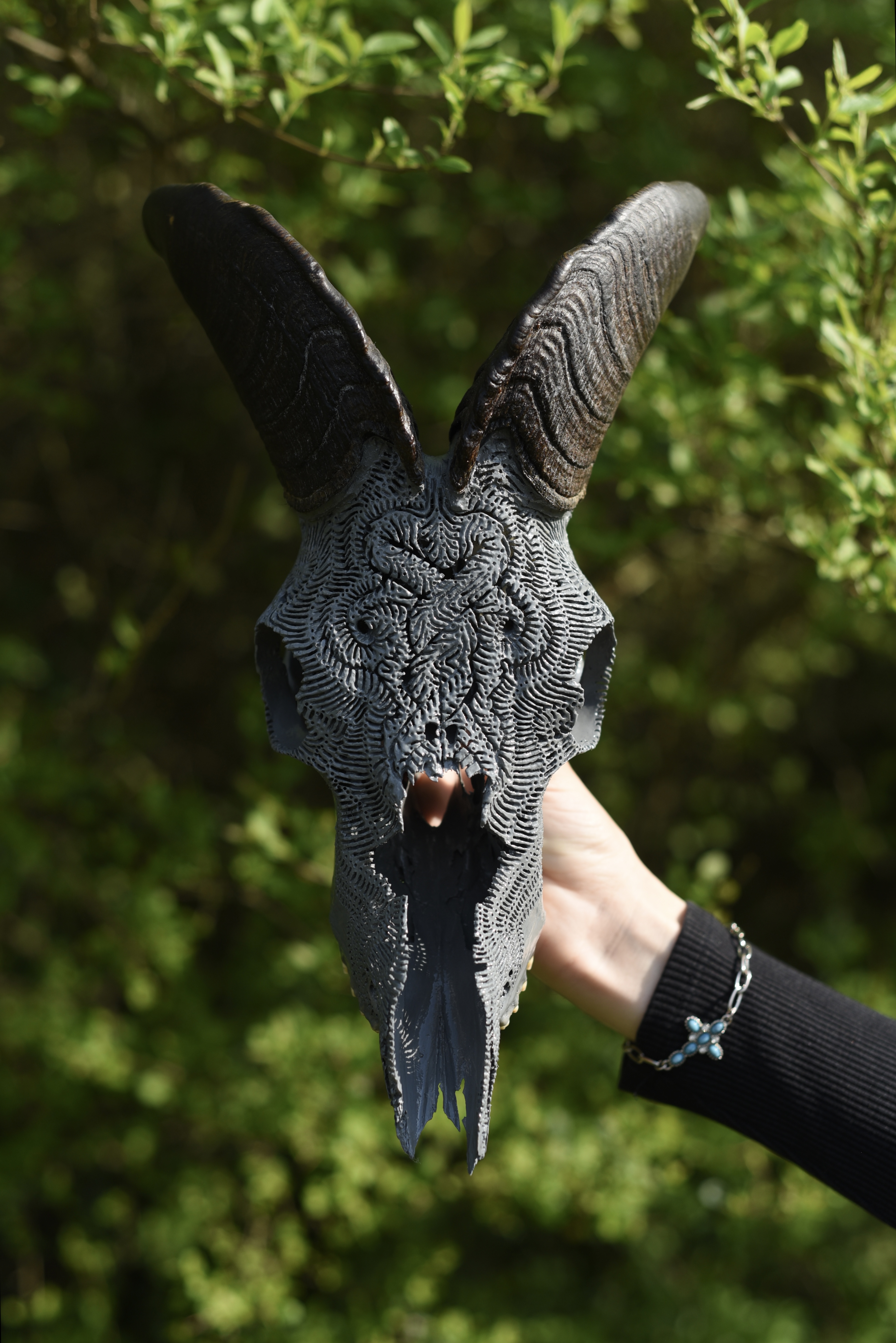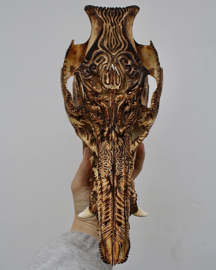 This is the skull of a Himalayan Tahr Goat, caught on Fraser Peak – located on the West coast of New Zealand. This piece is Hand-Carved and painted with an oil base stain, finished off with a protective varnish. Hanger included on the back of skull.