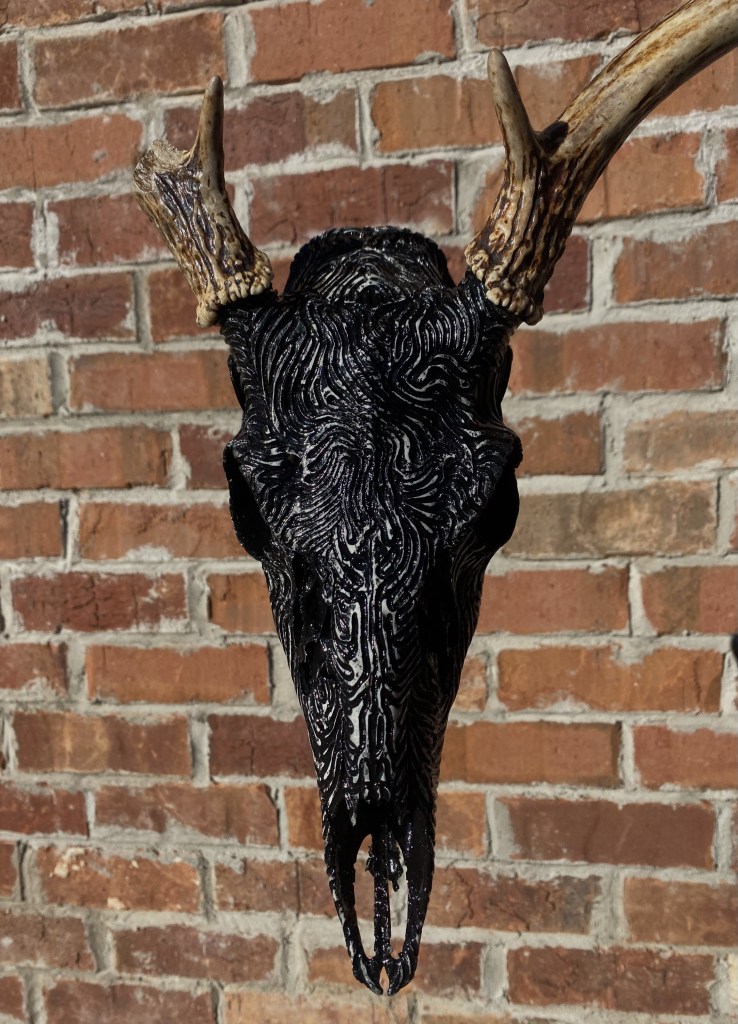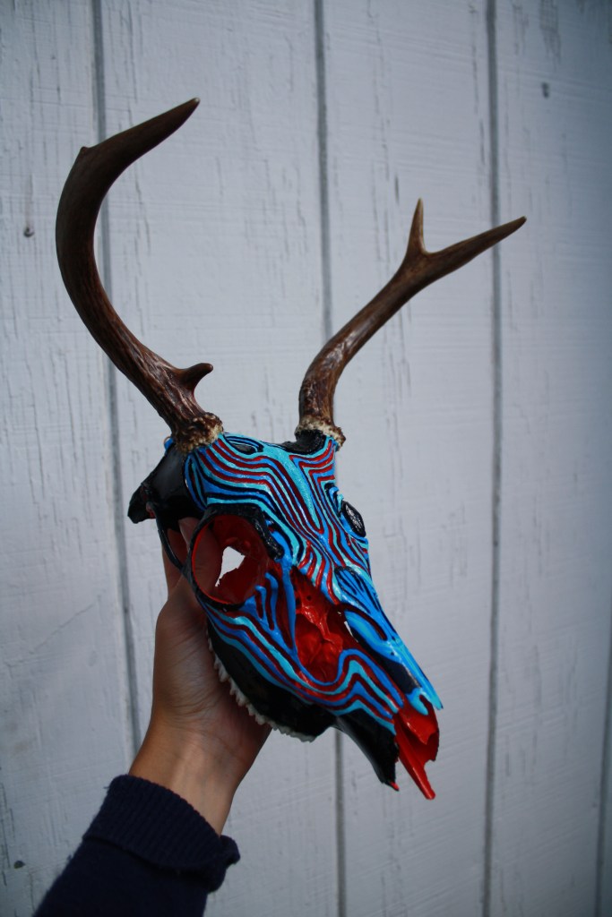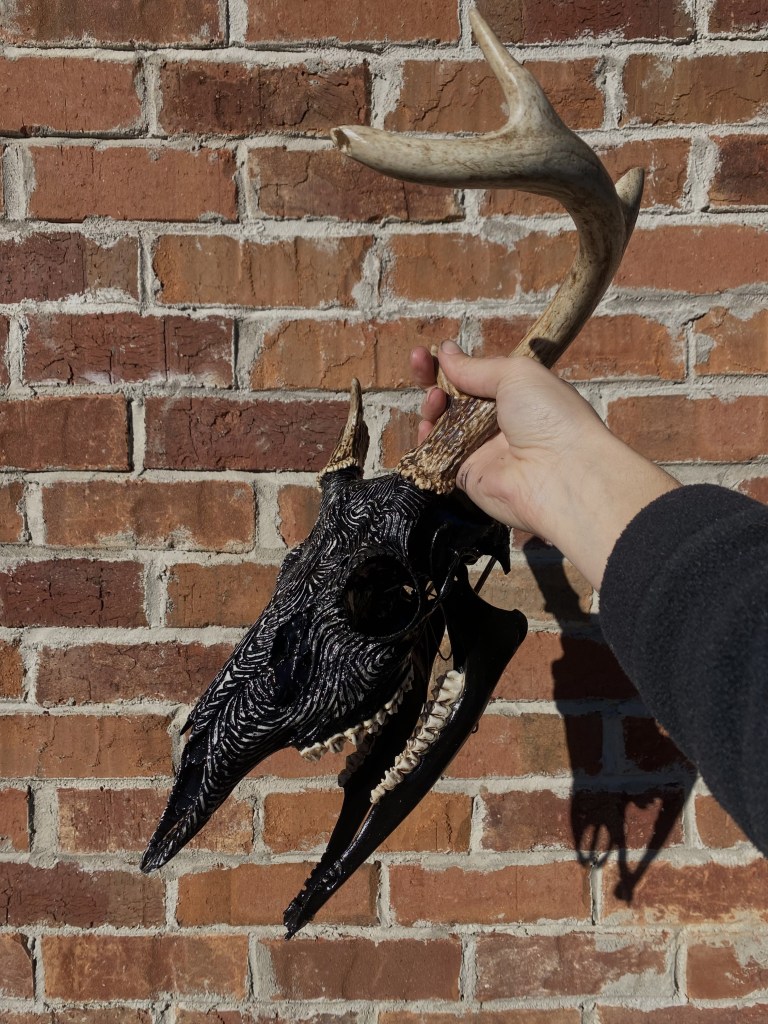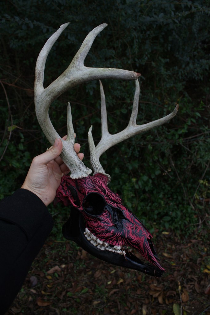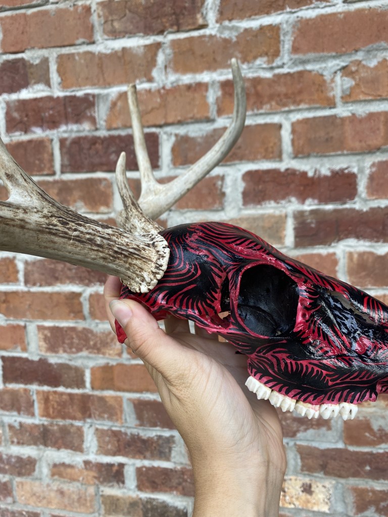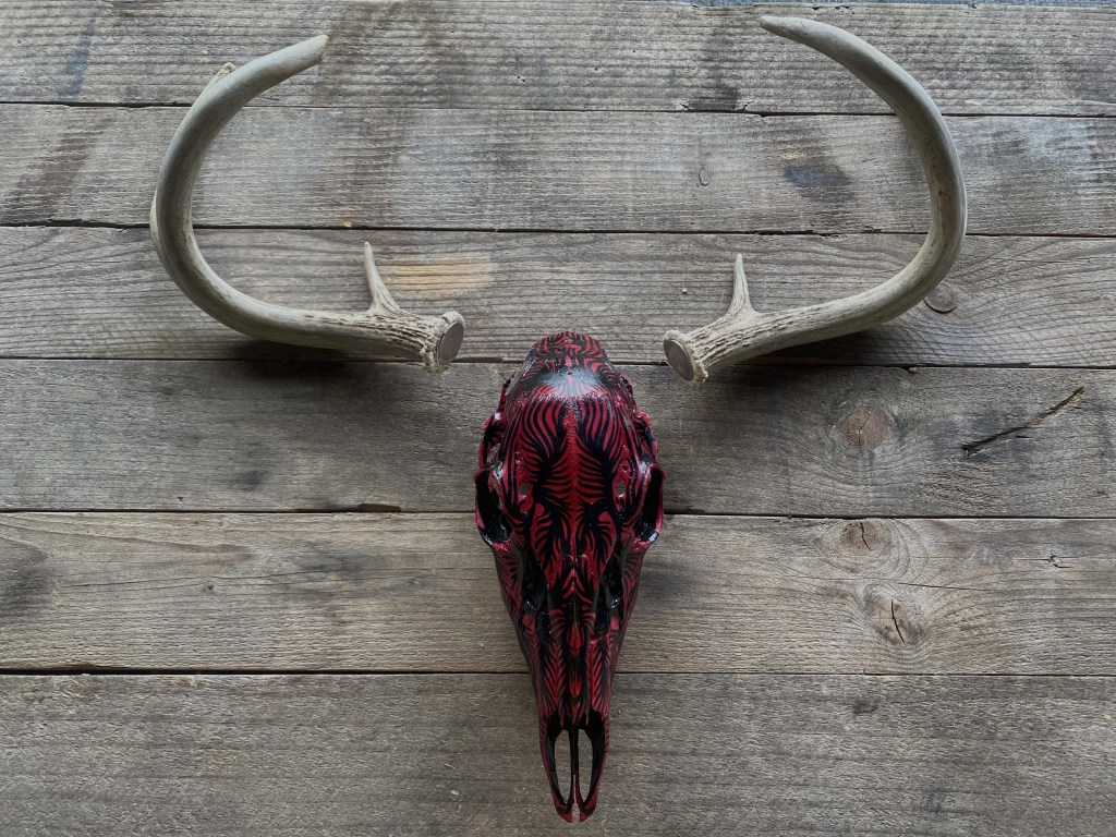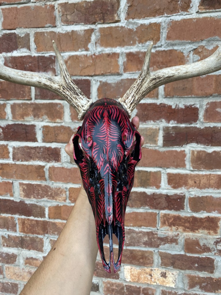 8-point Buck skull, jaw reattached to skull. Stained with a red dye, painted with black acrylic paint, finished off with a protective varnish. Wire hanger included (attached the back of skull). Contact me for more photos.