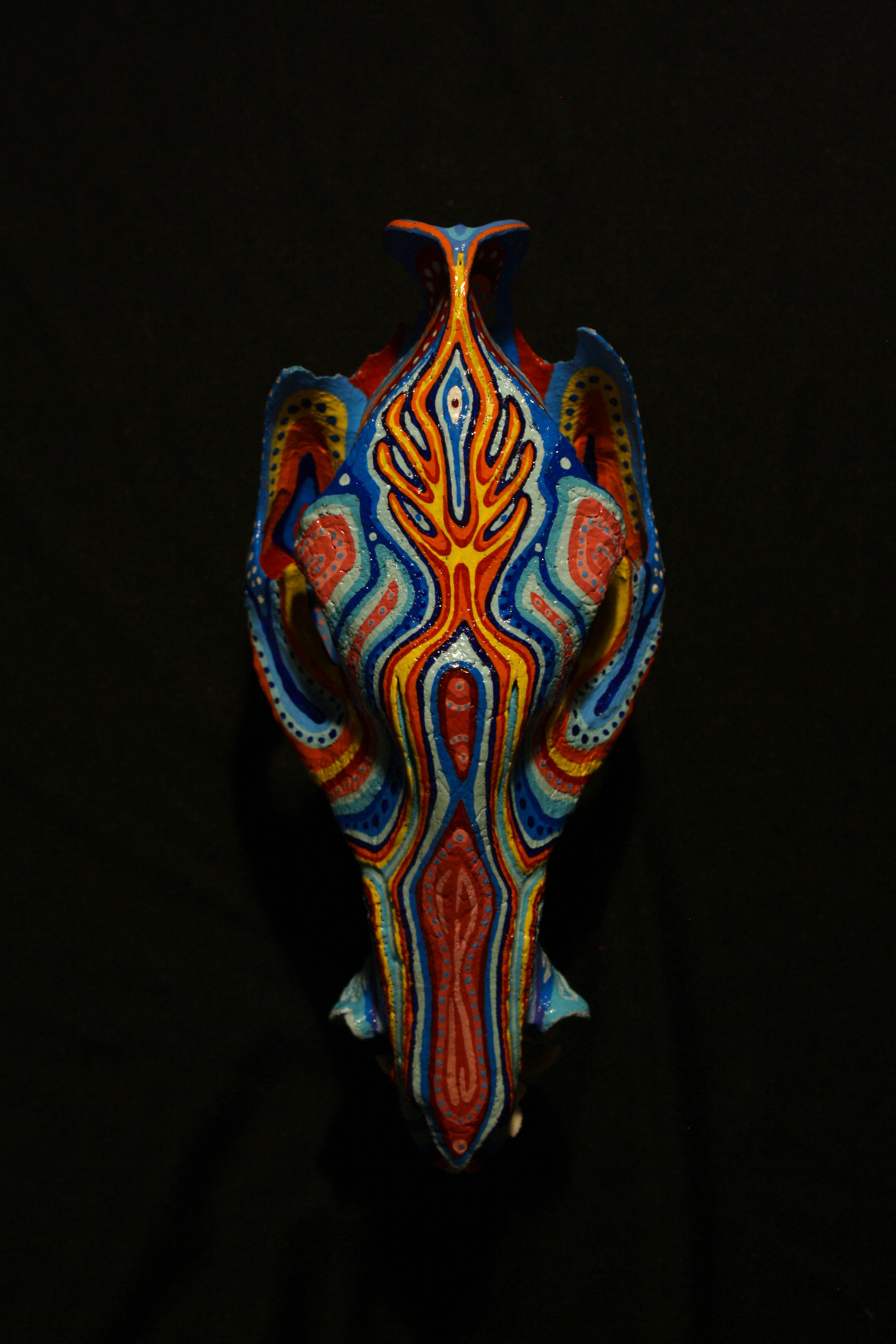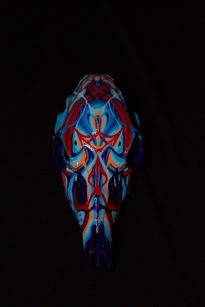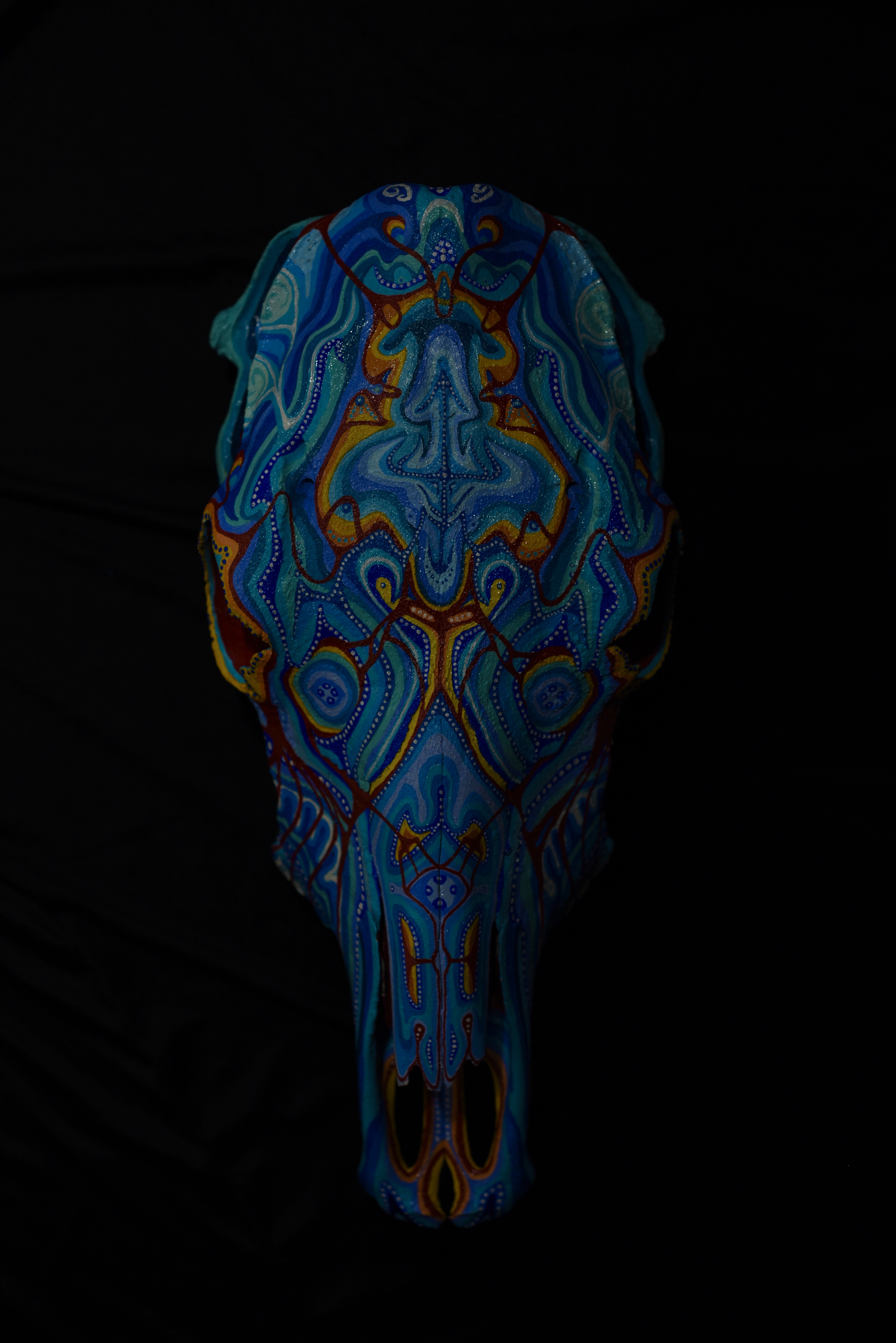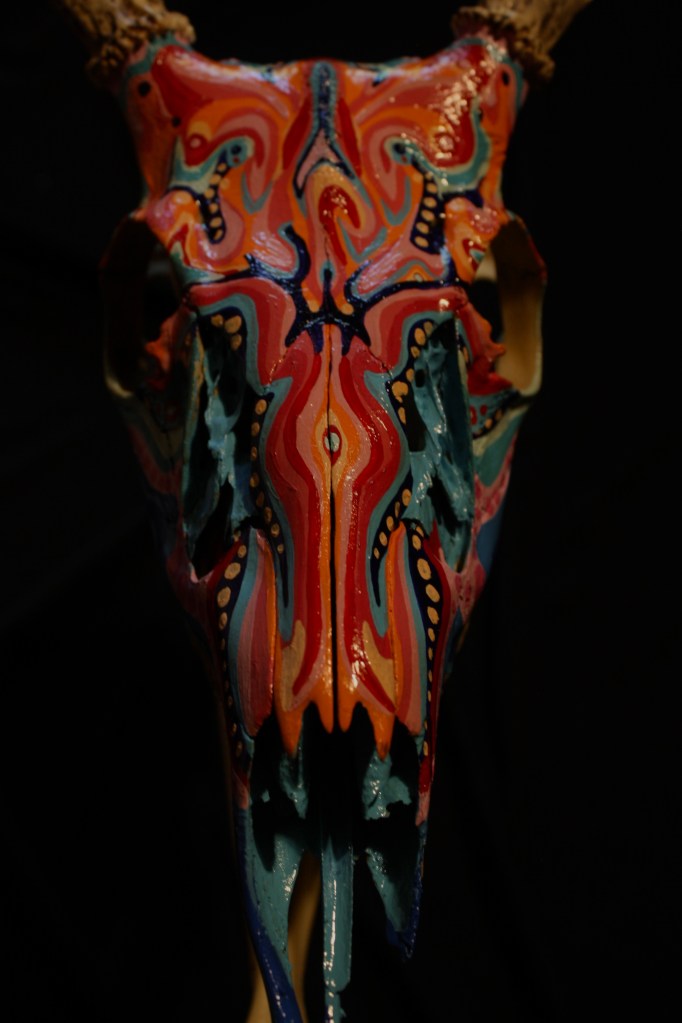 This is the skull of a female cow, measuring 18 inches in length. This piece is Hand-Painted with acrylic paints, finished off with a protective varnish. Hanger included on the back of skull.