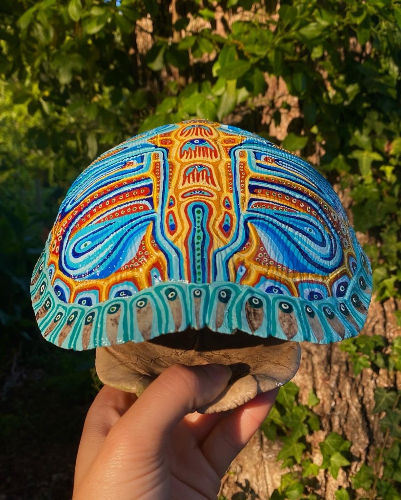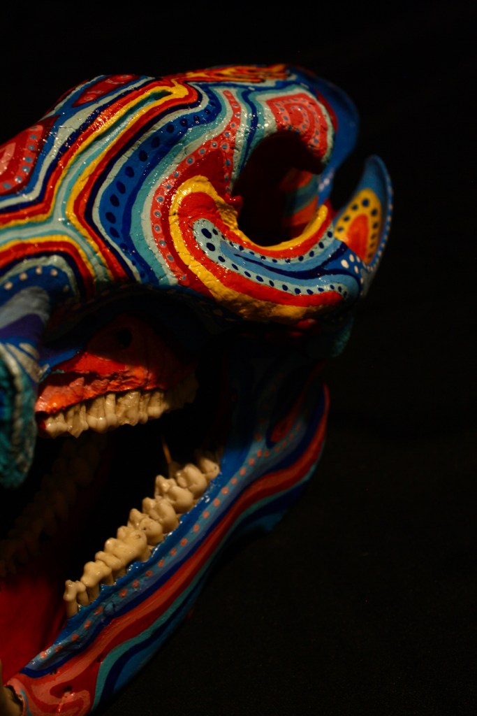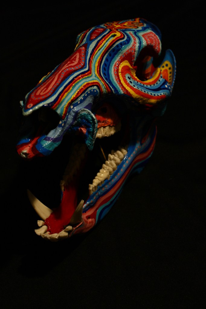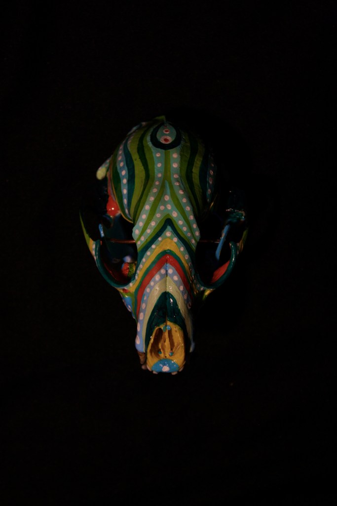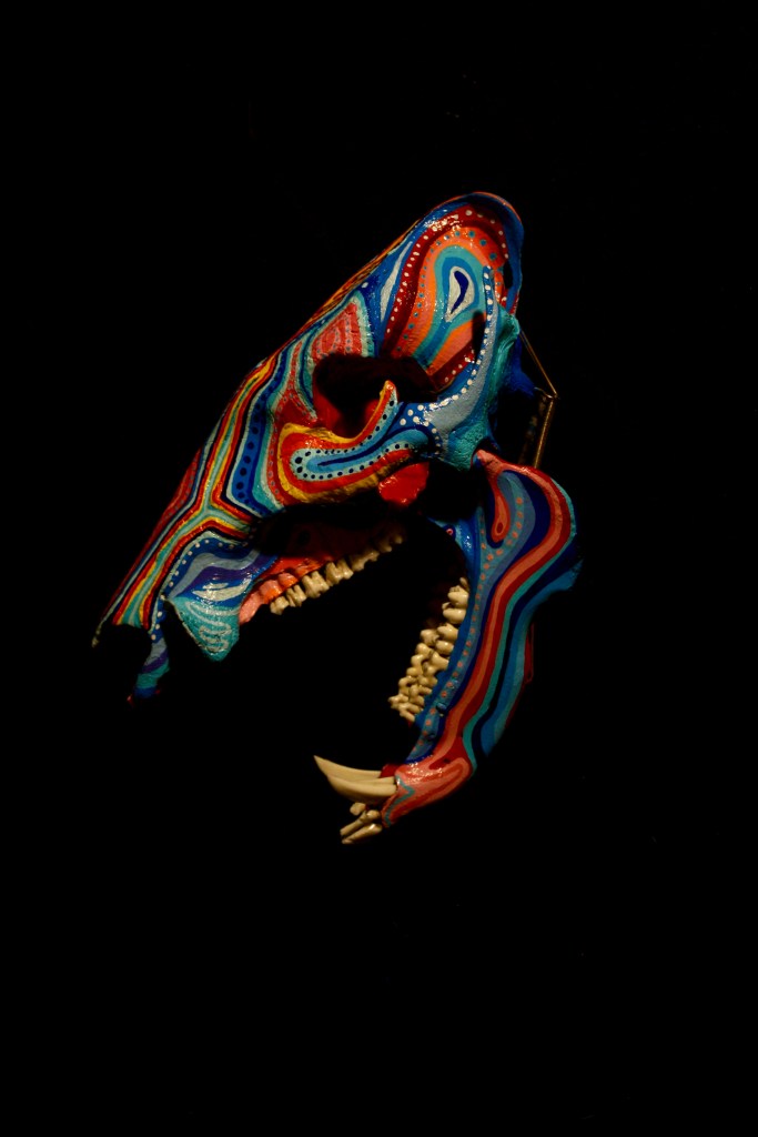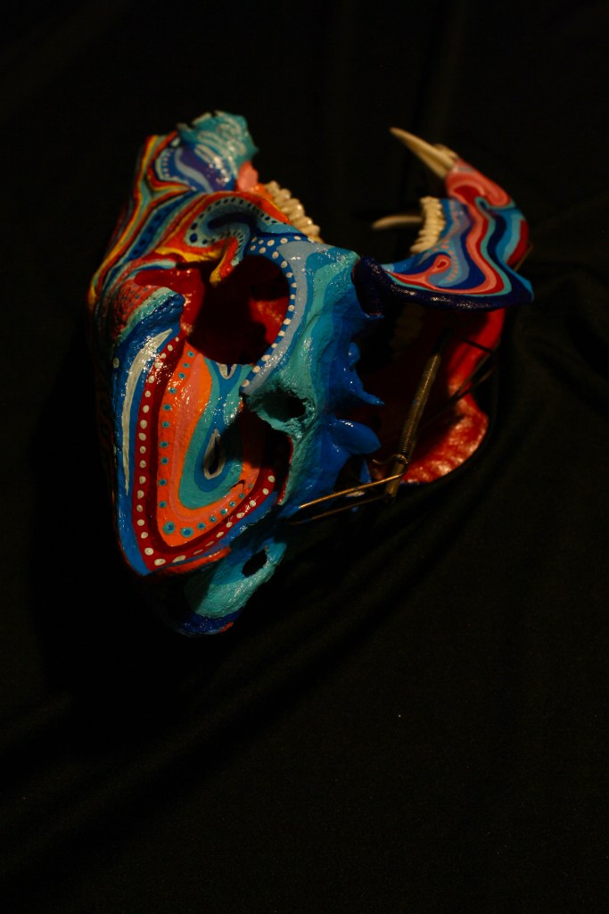 Boar skull found in Texas, hand-painted with acrylics, finished off with a protective varnish. Jaw re-attached with springs, able to open and close. Hanger included on the back of skull.